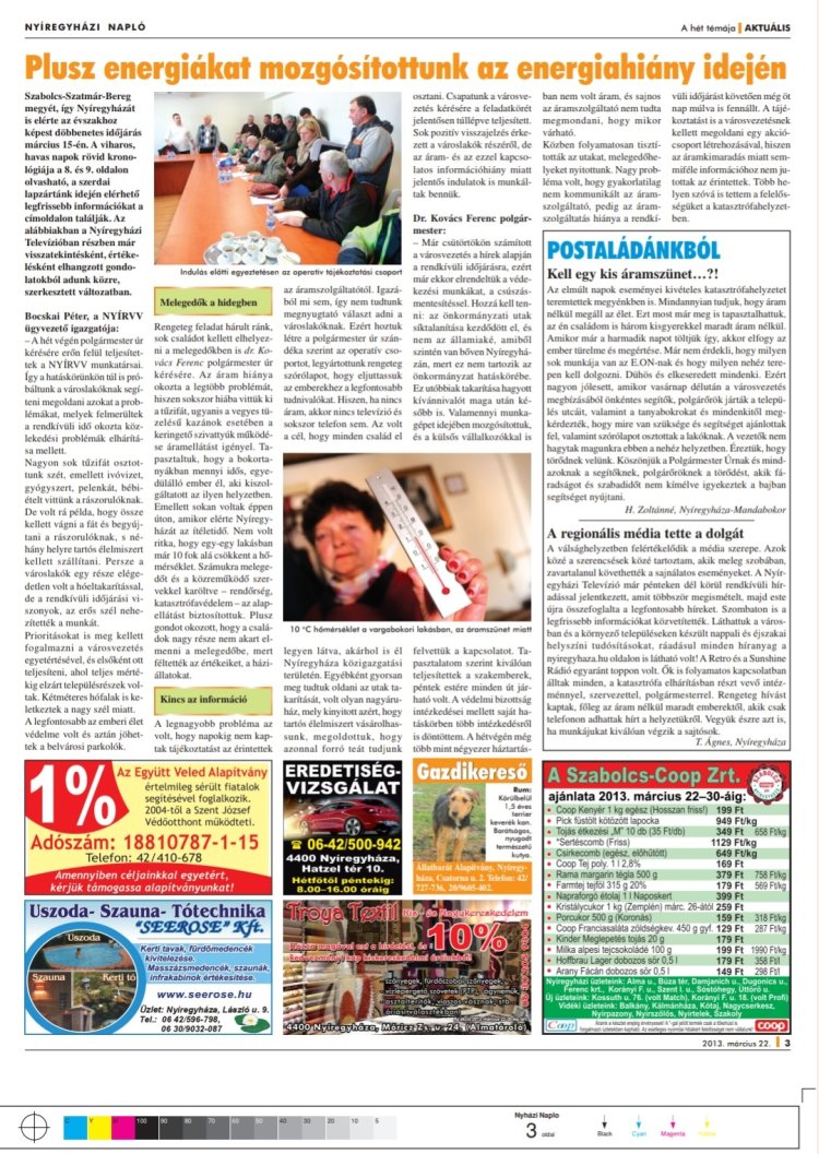 2013. március 14-én az éjszakai órákra a téli időjárás okozta közlekedési helyzet kritikussá vált. Nyíregyházán csütörtök este kezdődött a havazás, a városban és környékén 15-17 centiméteres hó hullott. Az orkán erejű széllökések miatt akkoriban több szakasz járhatatlanná vált. Szabolcs-Szatmár-Bereg megyében, és városunk egyes részeiben több ezer háztartás maradt áram nélkül. Az országban összesen, mintegy 270 000 ember került veszélybe a márciusi ítéletidő miatt.